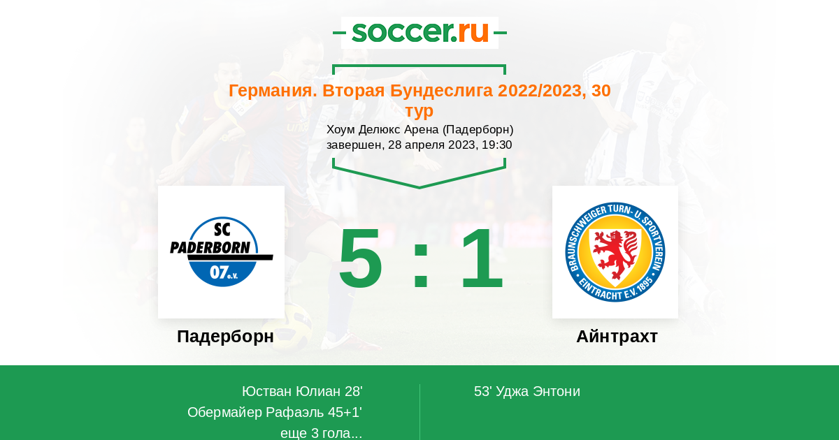 В этом матче между командами Падерборн и Айнтрахта ожидается интересная и весёлая игра. В которой каждая из команд будет стараться одержать победу чтобы порадовать своих болельщиков и даставить не забываемые радости успеха. Удачи