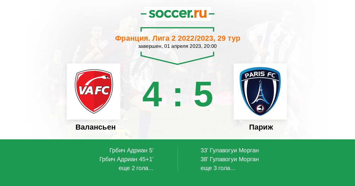 Протокол матча Валансьен против Париж