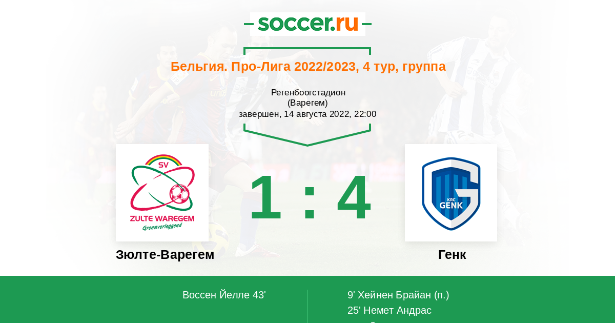Протокол матча Зюлте-Варегем против Генк
