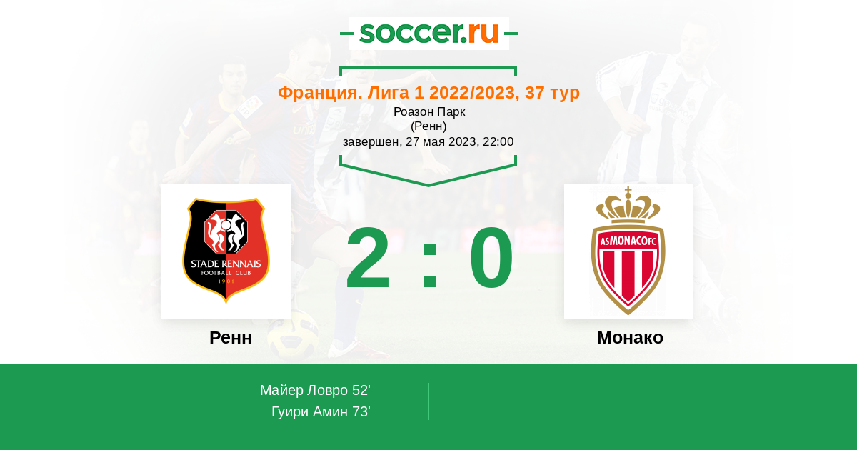 Я думаю что в этом противостоянии более чем явным фаворитом на победу выглядит команда хозяев поля Ренн , команда которая находится на данный момент времени в отличной форме , что нельзя сказать про команду гостей Монако . Очередное поражение Монако с разницей в два мяча .