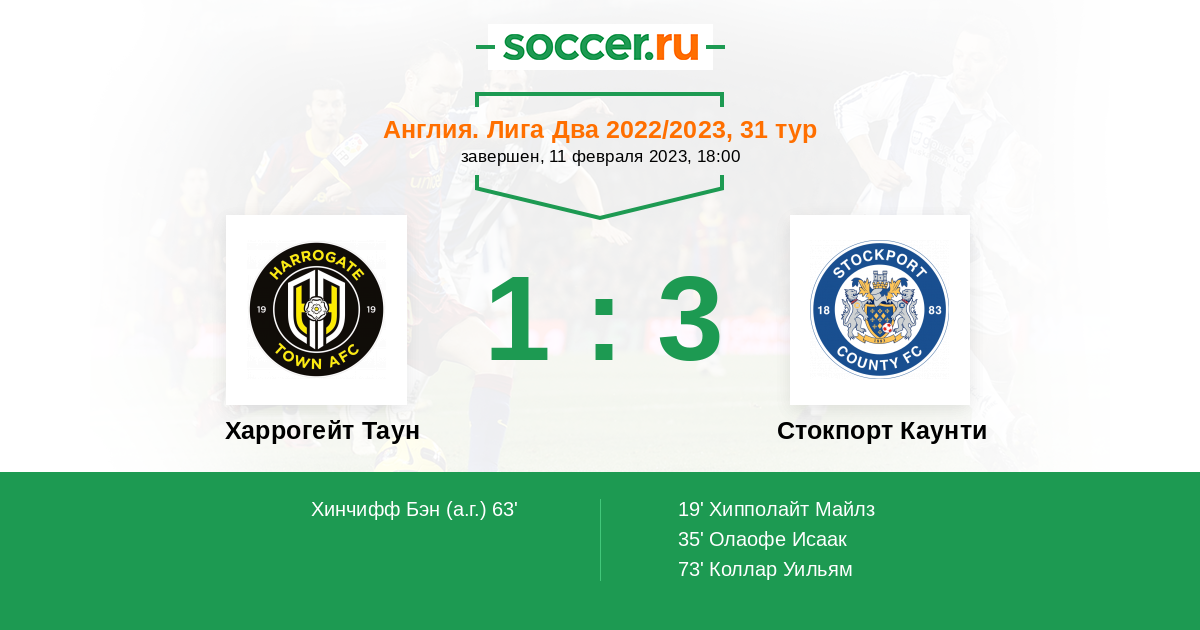 63' (1:2) Автогол Хинчифф Бэн (1)