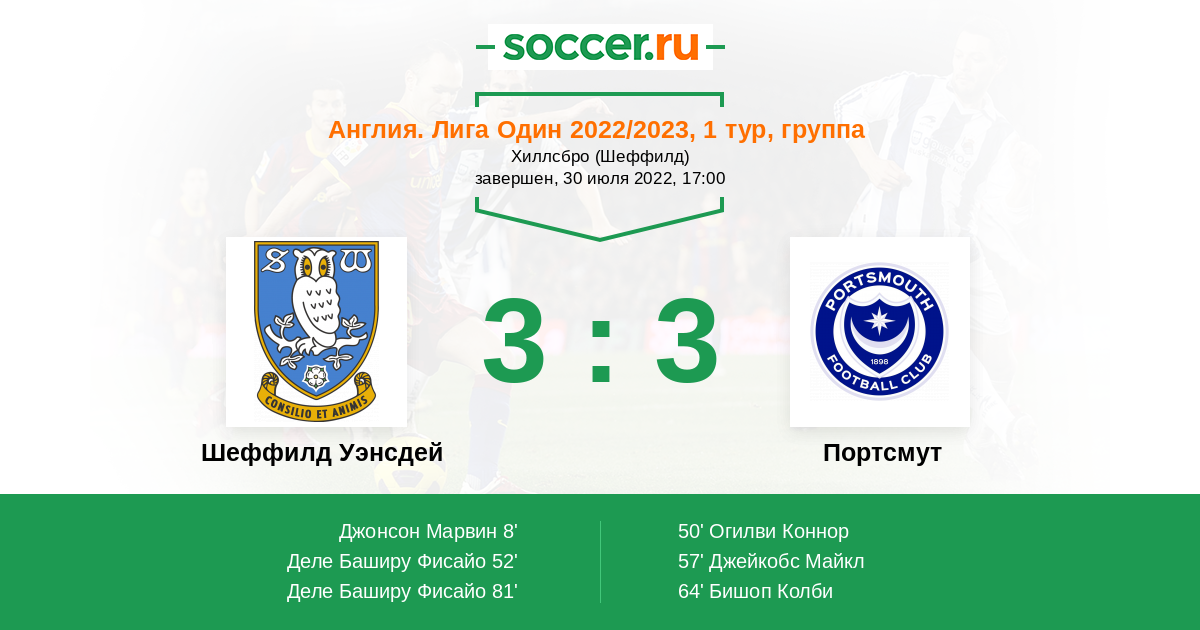 Протокол матча Шеффилд Уэнсдей против Портсмут