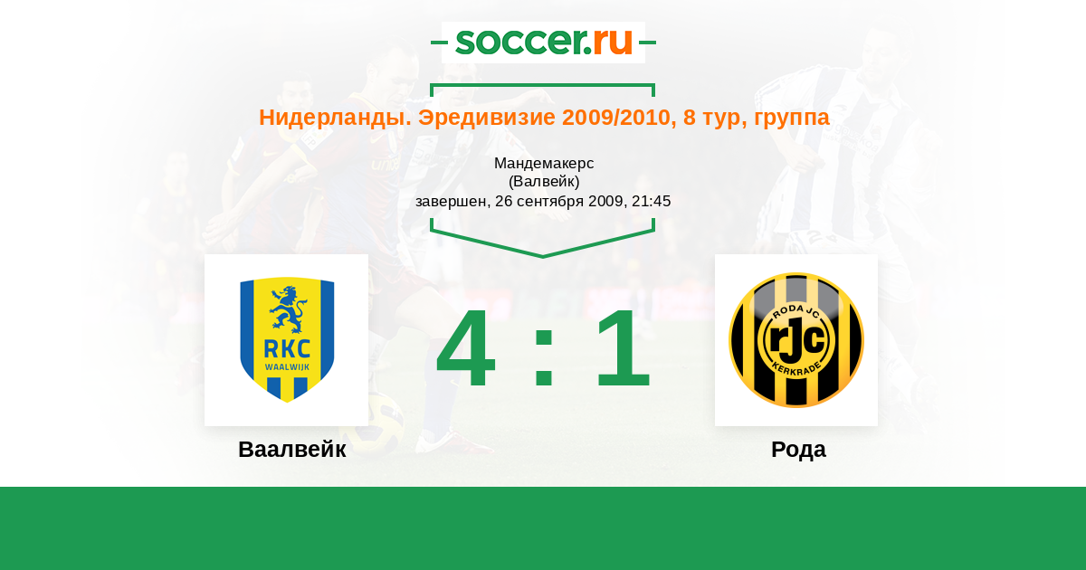 Нидерланды. Эредивизи 03.04.2010 Рода Логотип футбольный клуб Рода (Керкраде) 5:1 Логотип футбольный клуб Ваалвейк (Валвейк) Ваалвейк
