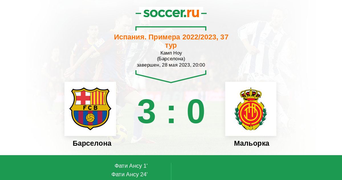 Барселона - Мальорка ! Барса будет стремится порадовать своих болельщиков сегодня крупной победой находясь в ранге чемпиона . Гости все свои задачи на сезон закрыли . Предположу точный счёт 4:1 .