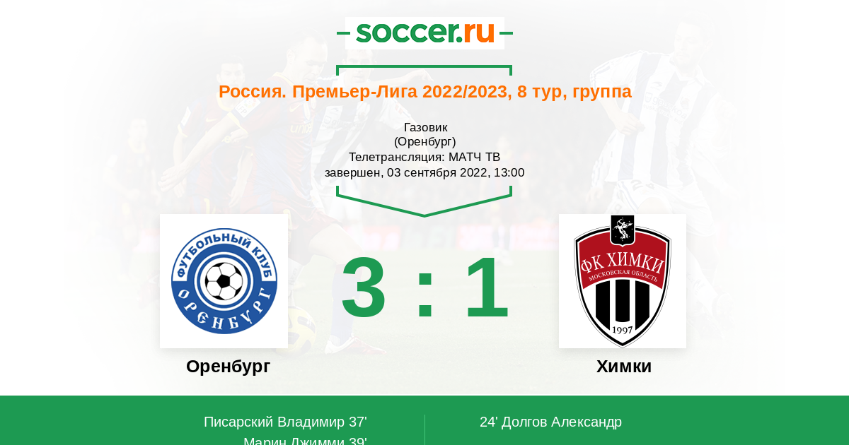 Протокол матча Оренбург против Химки