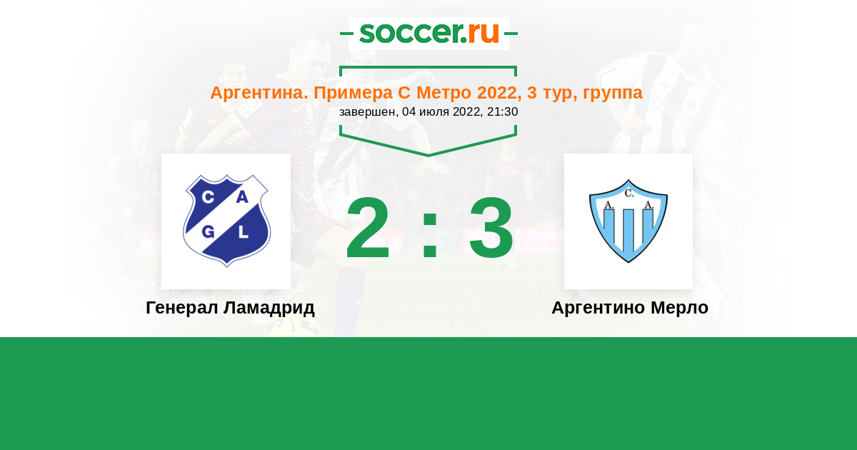 Аргентина. Примера С Метро 30.08.2015 Генерал Ламадрид Логотип Генерал Ламадрид (Буэнос-Айрес) 2:1 Логотип футбольный клуб Аргентино Мерло Аргентино Мерло