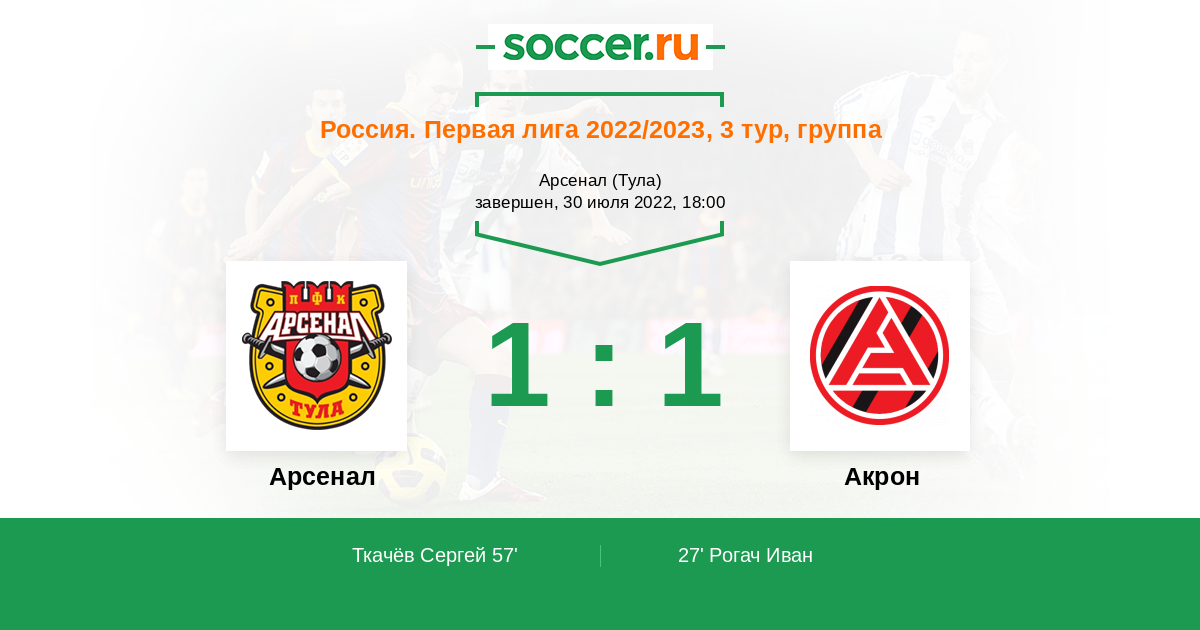 В матче встречающихся сегодня в российской Первой лиге команд Арсенал и Акрон рискну предположить победу хозяев потому, как их рейтинг выступления в национальном первенстве выше гостей, плюс фактор своего поля.
