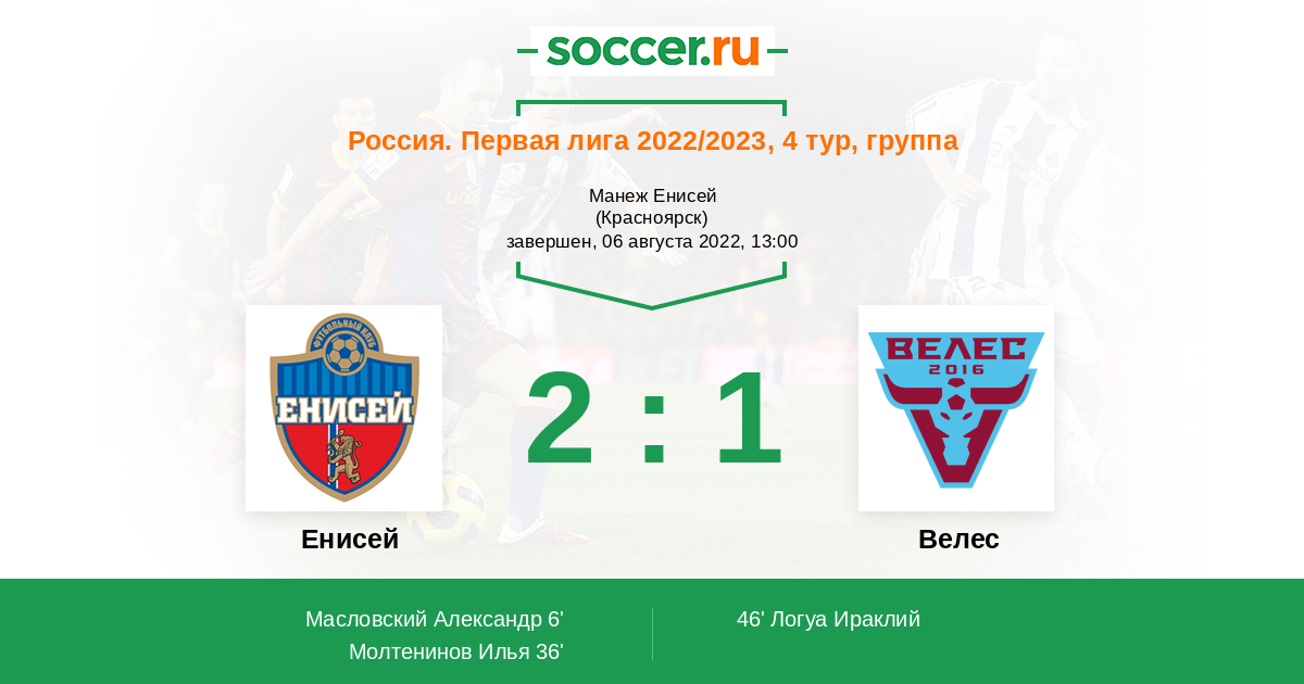 Протокол матча Енисей против Велес