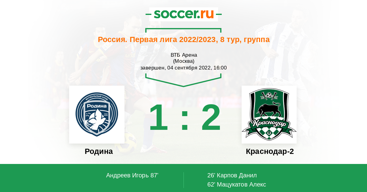 Протокол матча Родина против Краснодар-2