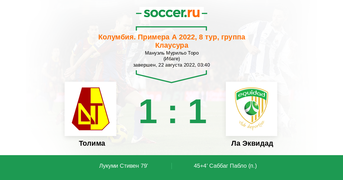 Протокол матча Толима против Ла Эквидад