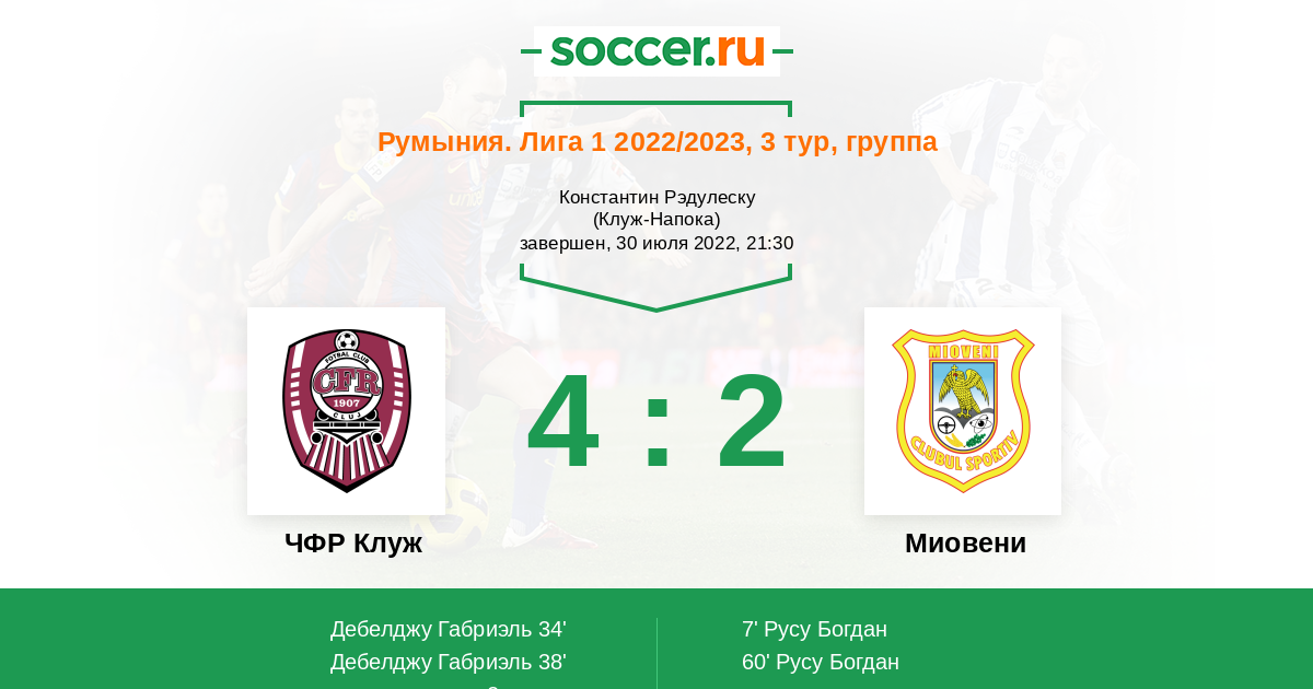Протокол матча ЧФР Клуж против Миовени