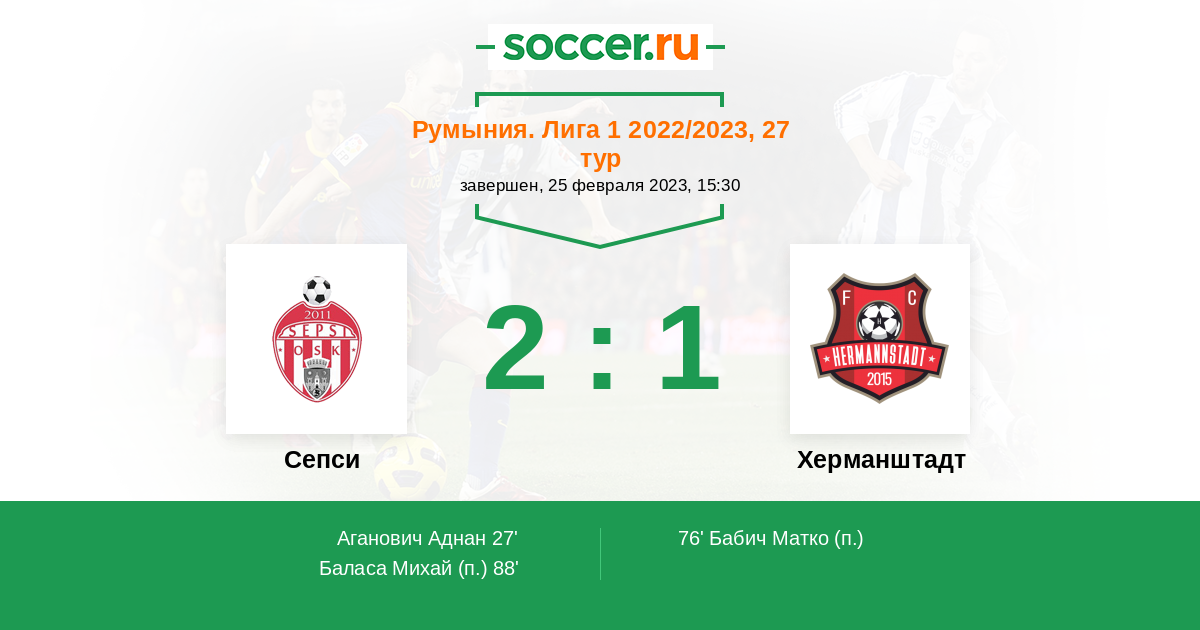 27' (1:0) Аганович Аднан (77) (Стефанеску Мариус (11))