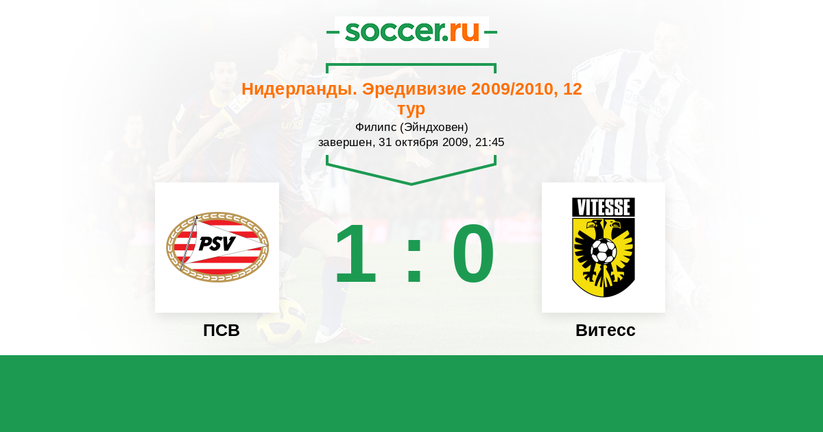 Нидерланды. Эредивизи 27.10.2010 Витесс Логотип футбольный клуб Витесс (Арнем) 0:2 Логотип футбольный клуб ПСВ (Эйндховен) ПСВ