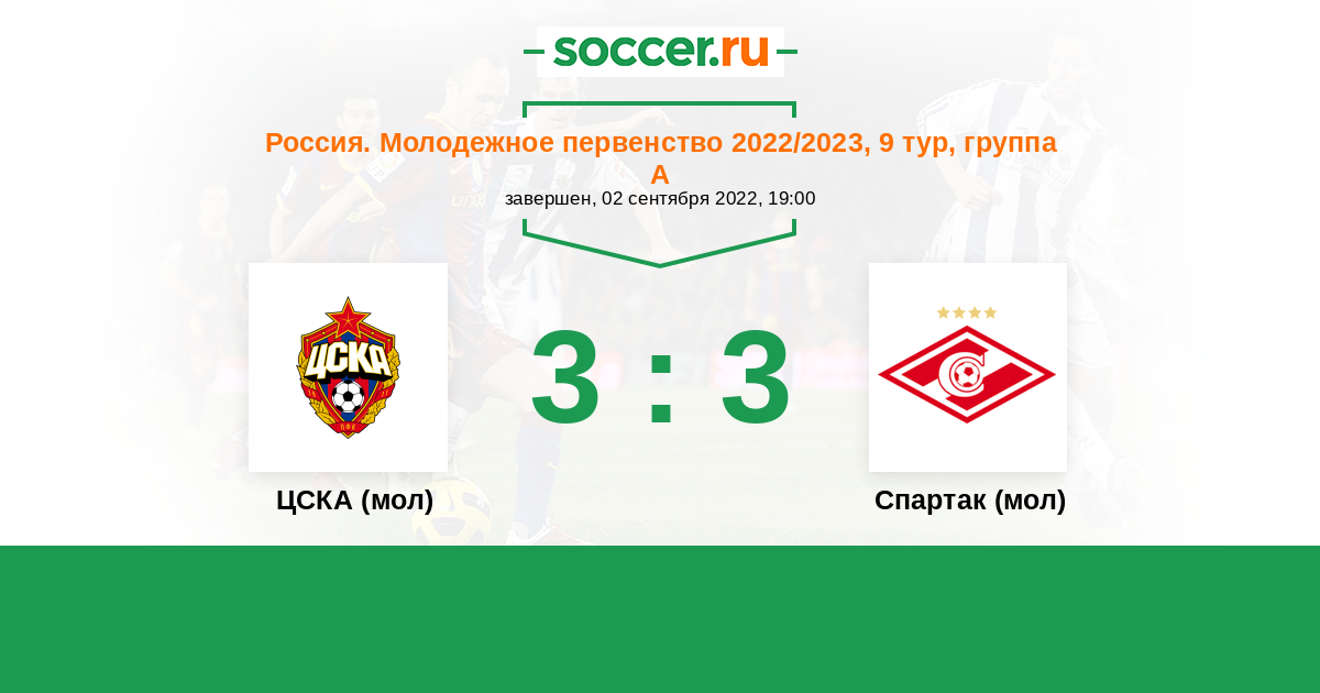 Россия. Премьер-Лига U21 10.09.2021 ЦСКА (мол) Логотип футбольный клуб ЦСКА (мол) (Москва) 3:0 Логотип футбольный клуб Спартак (мол) (Москва) Спартак (мол)