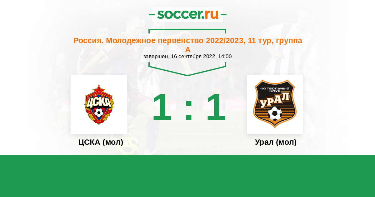 Россия. Премьер-Лига U21 26.09.2014 Урал (мол) Логотип футбольный клуб Урал (мол) (Екатеринбург) 0:0 Логотип футбольный клуб ЦСКА (мол) (Москва) ЦСКА (мол)