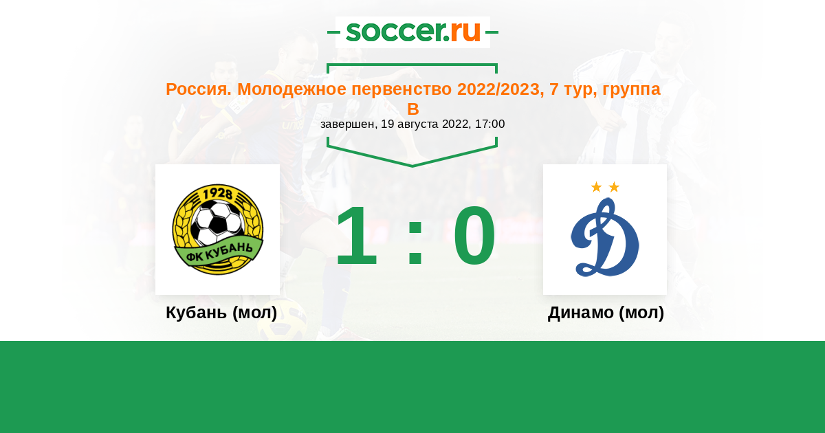 Россия. Премьер-Лига U21 28.10.2022 Динамо (мол) Логотип футбольный клуб Динамо (мол) (Москва) 1:1 Логотип футбольный клуб Кубань (мол) (Краснодар) Кубань (мол)