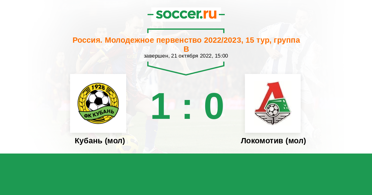 Россия. Премьер-Лига U21 31.10.2015 Кубань (мол) Логотип футбольный клуб Кубань (мол) (Краснодар) 2:0 Логотип футбольный клуб Локомотив (мол) (Москва) Локомотив (мол)