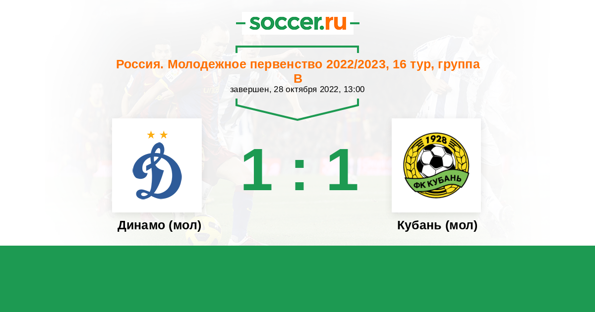 Россия. Премьер-Лига U21 19.08.2022 Кубань (мол) Логотип футбольный клуб Кубань (мол) (Краснодар) 1:0 Логотип футбольный клуб Динамо (мол) (Москва) Динамо (мол)