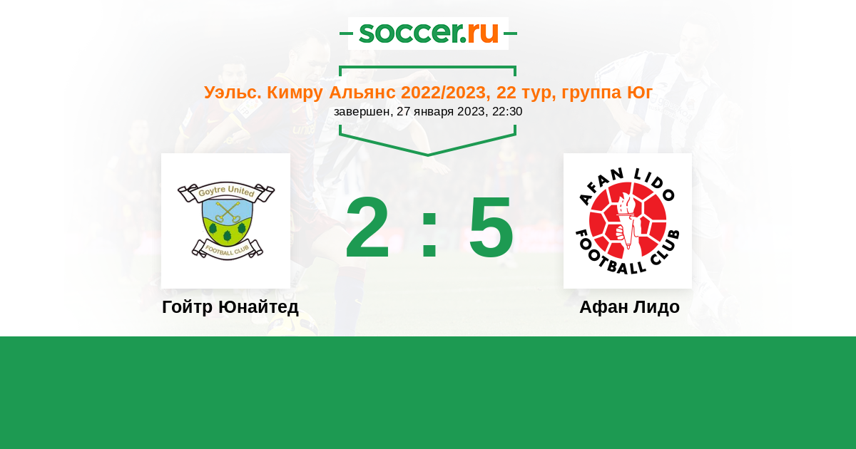Уэльс. Кимру Альянс 23.02.2024 Афан Лидо Логотип футбольный клуб Афан Лидо (Порт-Толбот) 1:2 Логотип футбольный клуб Гойтр Юнайтед (Порт-Толбот) Гойтр Юнайтед
