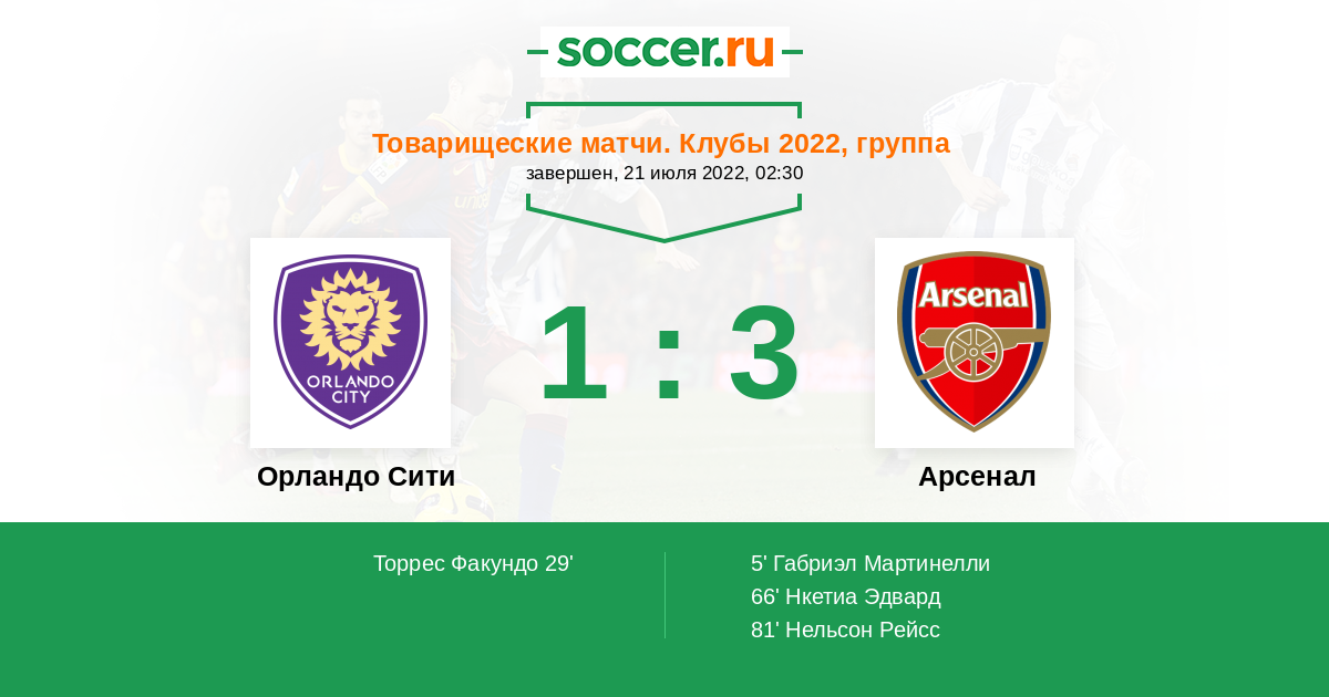 Протокол матча Орландо Сити против Арсенал