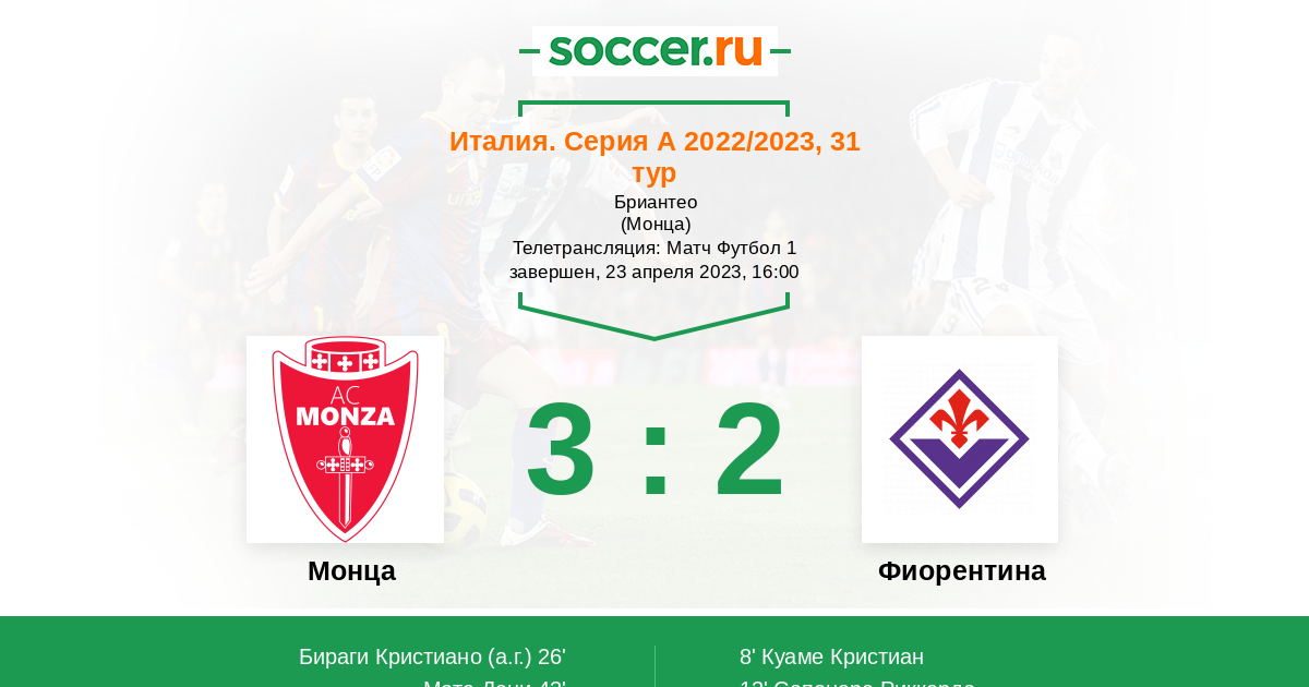 Смотрел этот матч . И там в начале Монца горела 0:2 . Думал матч так и закончится . Неожиданно однако видеть победу Монцы .