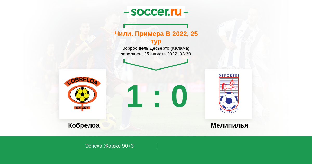 В предстоящем матче 25 - го тура чилийской Примеры В между командами Кобрелоа и Мелипилья , фаворитом на победу является команда хозяев Кобрелоа , так как они играют убедительнее и матч пройдет у них дома.