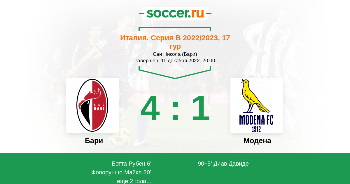 В этом матче между командами Бари и Модена фаворитом является команда хозяев поля. Они в этом сезоне играют очень хорошо, тем более, если учесть, что клуб перешёл из Серии С, прямо и очень впечатляет уровень игры команды. Модена тоже перешла из Серии С, но такого успеха у них пока что не наблюдается, а тут ещё матч гостевой для них, который так важен хозяевам, но возможно гости свой гол и забьют. Удачи