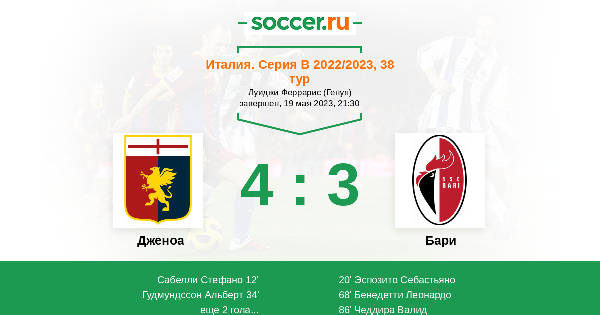 12' (1:0) Сабелли Стефано (2) (Кода Массимо (9))
