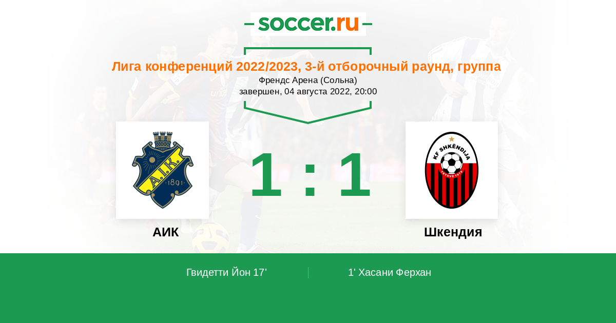 Протокол матча АИК против Шкендия