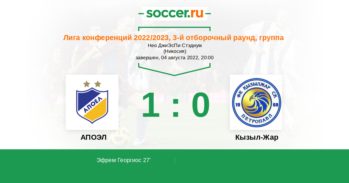 Протокол матча АПОЭЛ против Кызыл-Жар