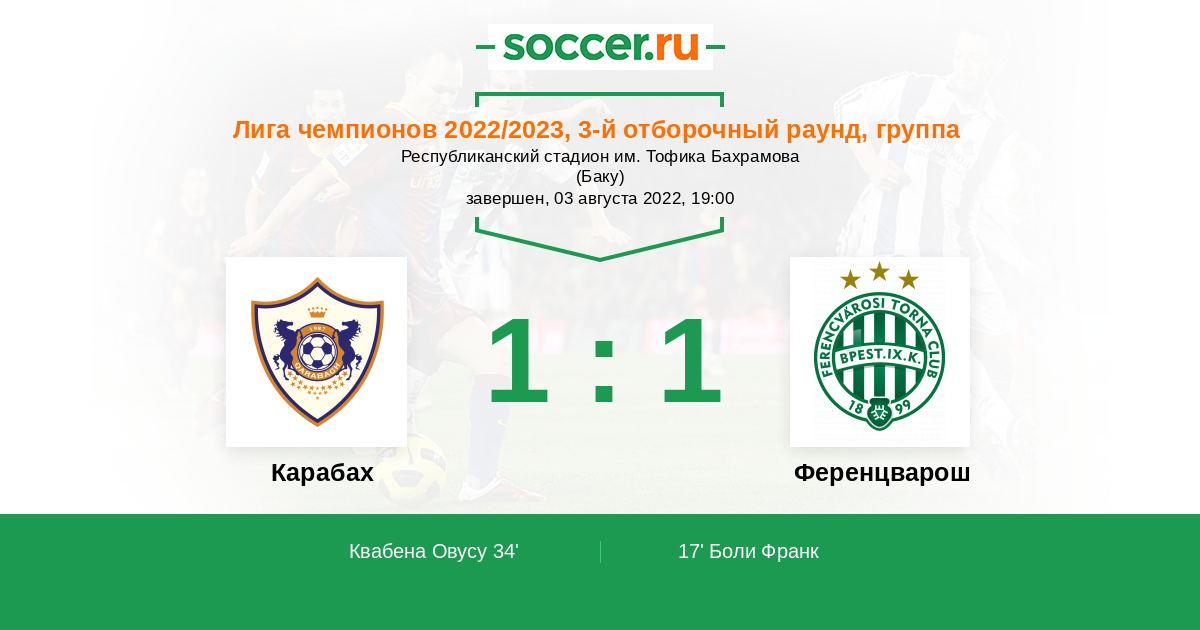 Протокол матча Карабах против Ференцварош