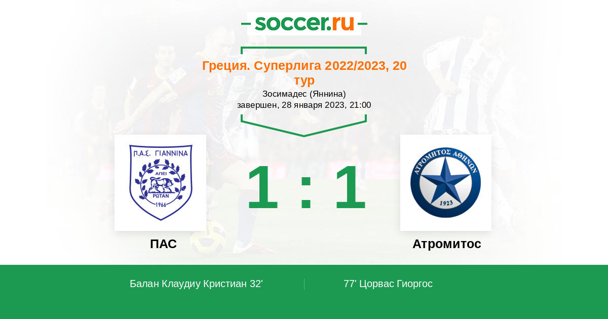 32' (1:0) Балан Клаудиу Кристиан (91) (Памлидис Гиоргос (14))