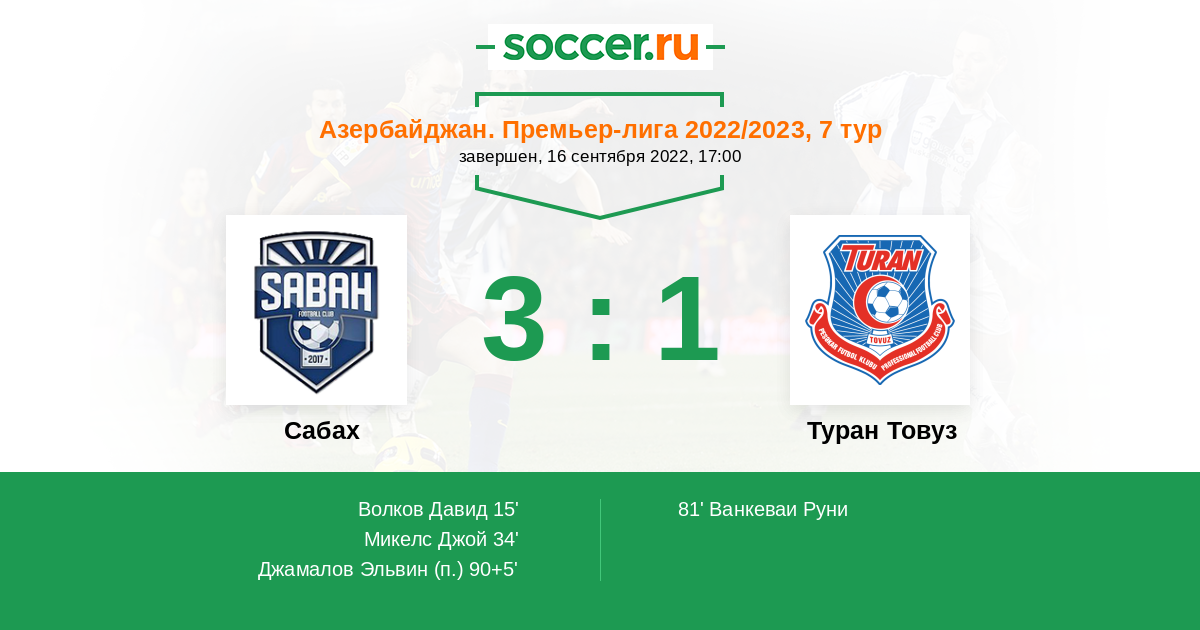 Протокол матча Сабах против Туран Товуз