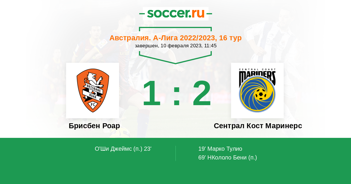 Протокол матча Брисбен Роар против Сентрал Кост Маринерс