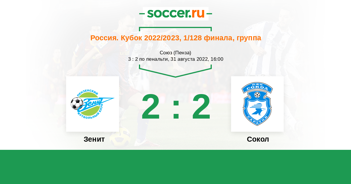 Россия. Вторая лига. Группа 3 04.09.2022 Зенит Логотип футбольный клуб Зенит (Пенза) 0:0 Логотип футбольный клуб Сокол (Саратов) Сокол