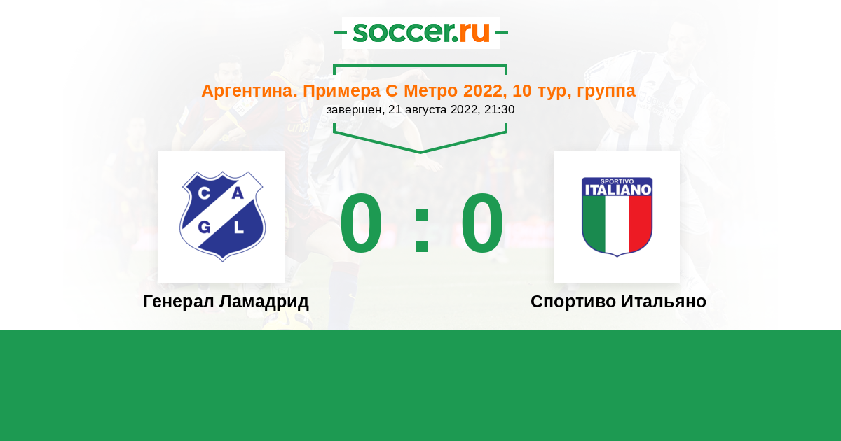 Аргентина. Примера С Метро 26.10.2021 Генерал Ламадрид Логотип Генерал Ламадрид (Буэнос-Айрес) 1:1 Логотип футбольный клуб Спортиво Итальяно (Буэнос-Айрес) Спортиво Итальяно