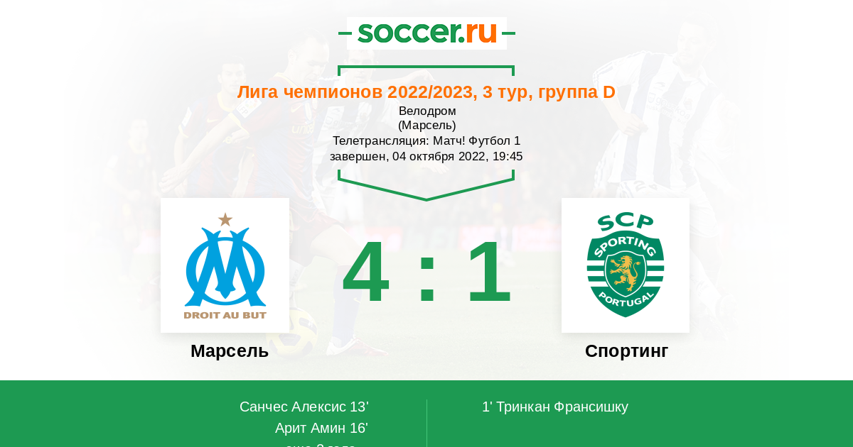 Лига Чемпионов, 3-й тур ! Марсель проиграл Тоттенхему и Айнтрахту идут на последнем месте ! Матч пройдет без болельщиков марселя Уефа так не потерпел поведение болельщиков ! Спортинг хорошо играет и думаю смогут победить ! Букмекер сделал фаворитом марсель, но по моему имхо здесь явный фаворит Спортинг !