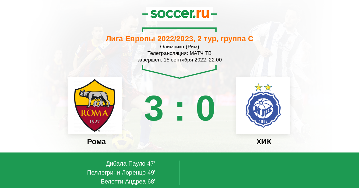 Протокол матча Рома против ХИК
