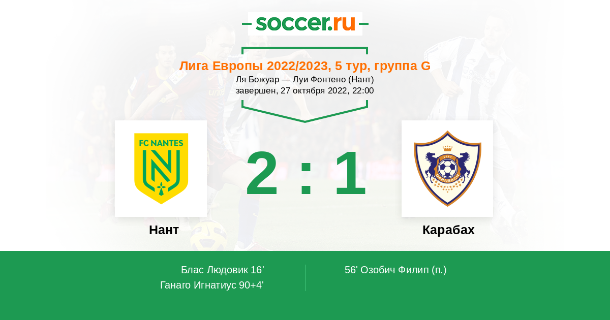 В этом матче между командами Нанта и Карабаха ожидается интересная игра. В которой команде хозяев поля нужна только победа. Соответственно гости будут играть на контратаках, где у 3 это хорошо получается. Прогноз, тотал больше в 1-м тайме-1,5. Удачи