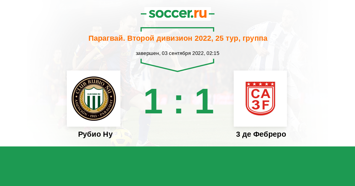 Парагвай. Второй дивизион 09.10.2021 3 де Фебреро Логотип футбольный клуб 3 де Фебреро (Сьюдад-дель-Эсте) 2:1 Логотип футбольный клуб Рубио Ну (Асунсьон) Рубио Ну