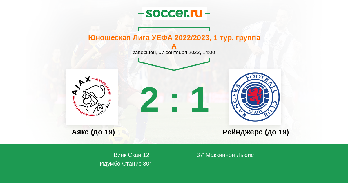 Протокол матча Аякс (до 19) против Рейнджерс (до 19)