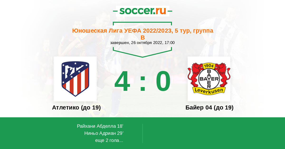 Протокол матча Атлетико (до 19) против Байер 04 (до 19)