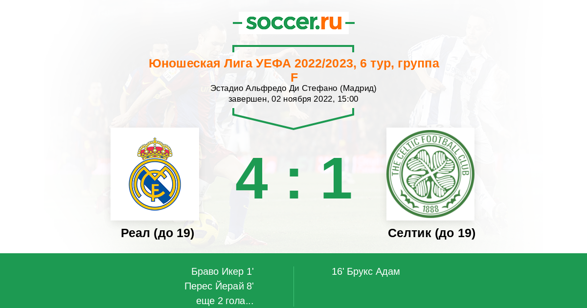 Протокол матча Реал (до 19) против Селтик (до 19)