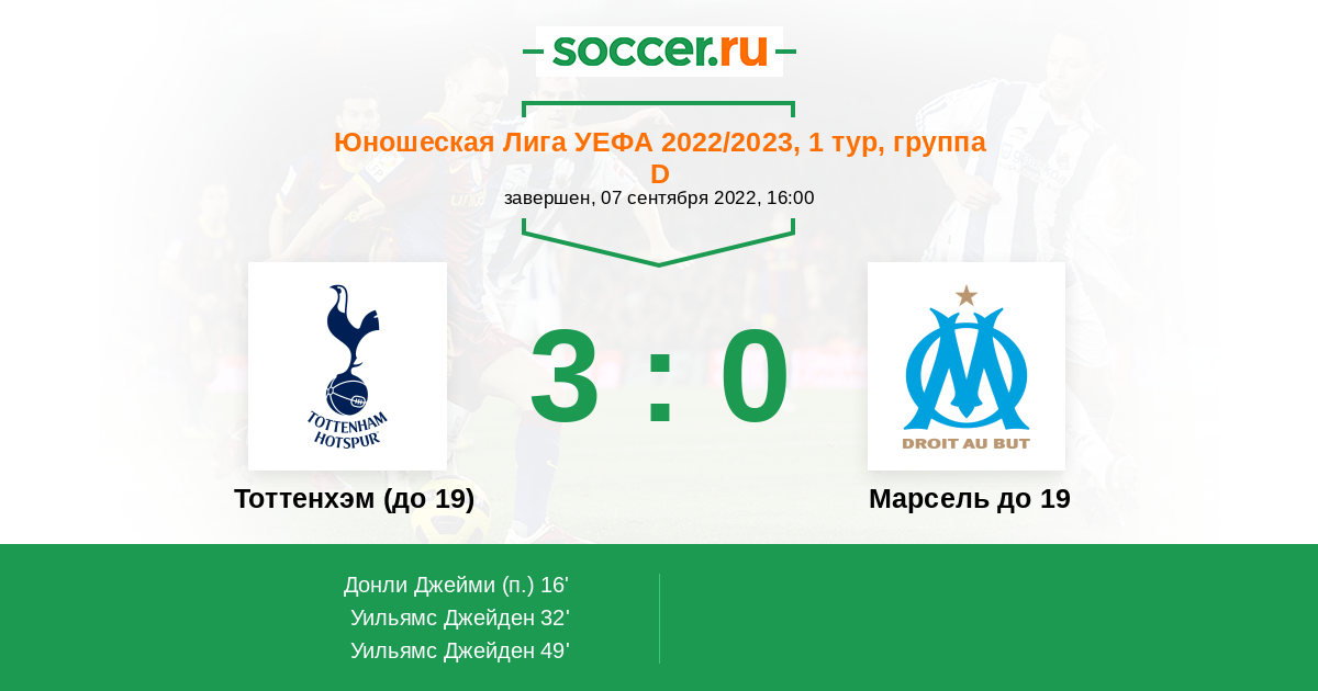 Протокол матча Тоттенхэм (до 19) против Марсель до 19