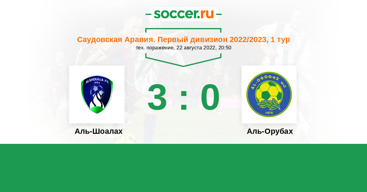 Саудовская Аравия. Первый дивизион 16.03.2022 Аль-Оруба Логотип футбольный клуб Аль-Оруба (Сакака) 0:0 Логотип футбольный клуб Аль-Шоалах (Эль-Хардж) Аль-Шоалах