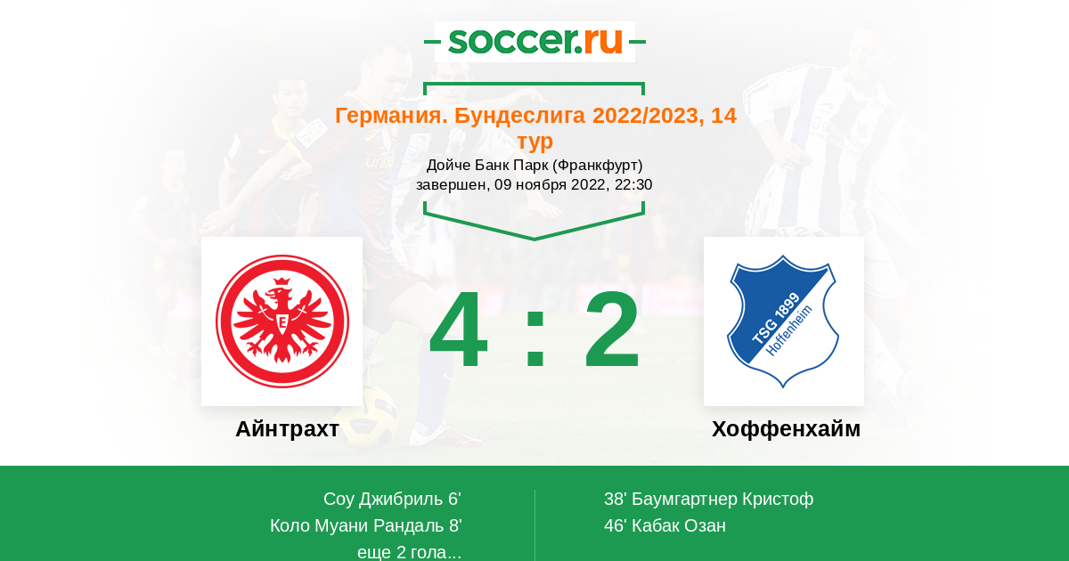 Я думаю что в этом противостоянии может быть любой исход , хотя сейчас скорее всего будет победа хозяев поля Айнтрахт или ничья , но точно с забитыми мячами с обеих сторон . Хоффенхайм обязательно даст бой команде хозяев поля. Очень интересный матч тура.