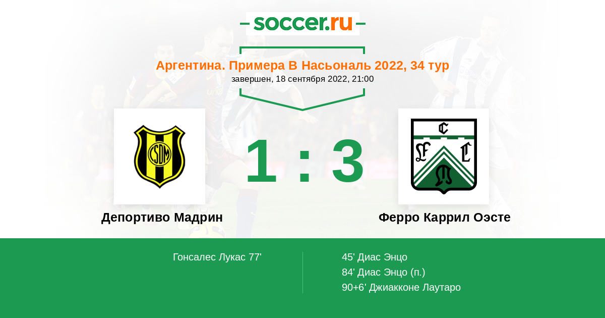 Протокол матча Депортиво Мадрин против Ферро Каррил Оэсте