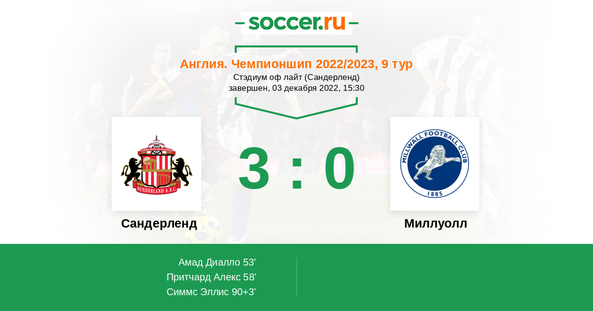 Протокол матча Сандерленд против Миллуолл