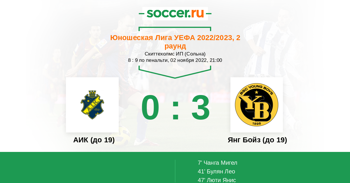 Протокол матча АИК (до 19) против Янг Бойз (до 19)