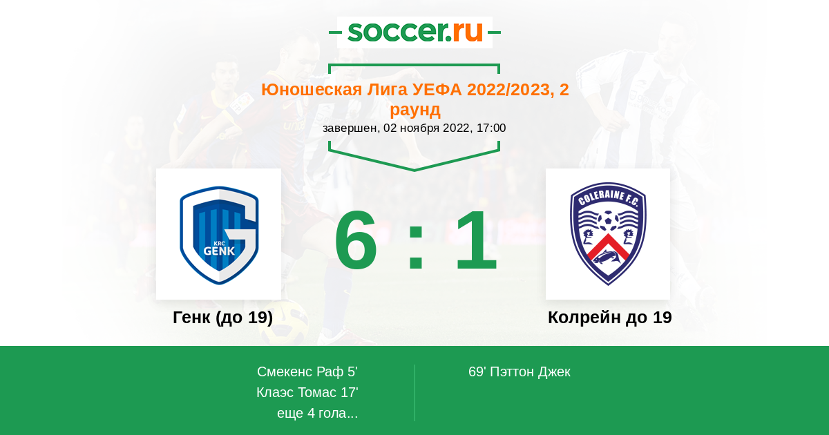 Протокол матча Генк (до 19) против Колрейн до 19
